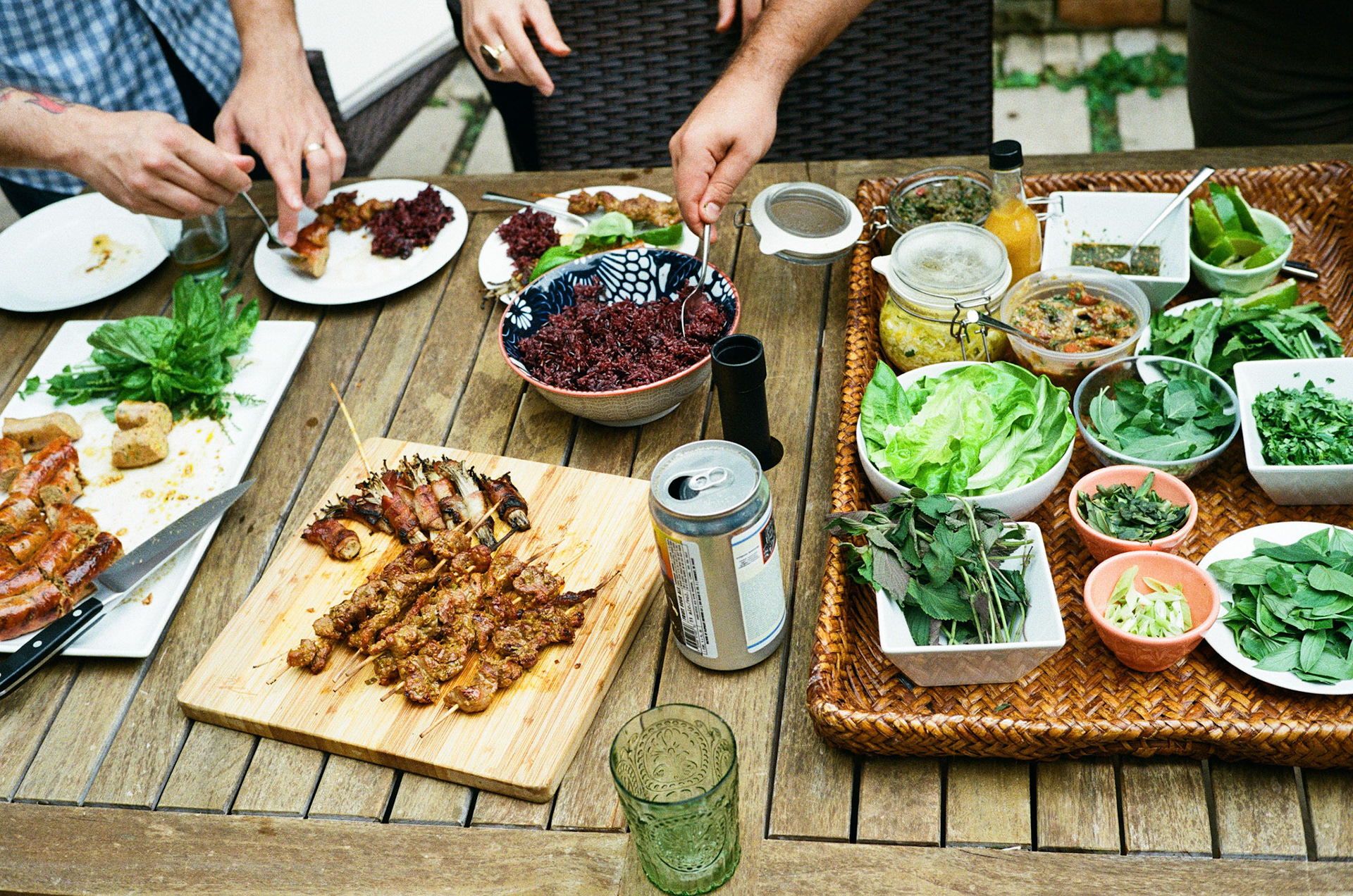 The meal started with a rather epic assortment of grilled meats and dipping sauces. Kyle made "Sai Ua" -- A spicy herbed sausage. I made beef skewers marinated in a curry paste heavy on lemongrass and ginger, as well as bacon wrapped enoki mushrooms. This was all served with an assortment of herbs, lettuce leaves and purple sticky rices as well as various dipping sauces. John made a Laotian roasted tomato sauce called Jeow Marg Len and I made another out of roasted eggplant called Jeow Mak Keua. We had to have the Thai standby -- Nam Jim (think Nuoc Cham, but slightly different).